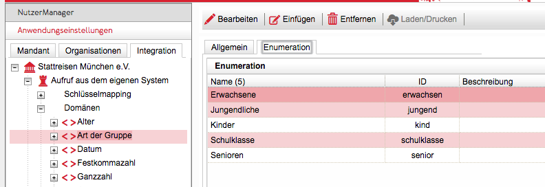 | Teilnehmerart | Anwendungseinstellungen→Mandant→StattBuchung→Veranstaltungen | Wertliste der Teilnehmerarten für gebuchte und offene Programme. Diese werden für die statistische Auswertung und die Berechnung von Preisen verwendet |