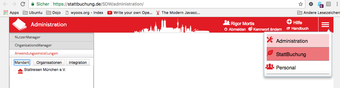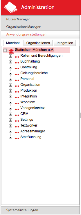 Der aktuelle ApplicationContainer ist farblich hinterlegt (im Beispiel Administration), ebenfalls im Beispiel zeigt die Maus auf "StattBuchung", deshalb ist die Auswahl ebenfalls farblich hervorgehoben.