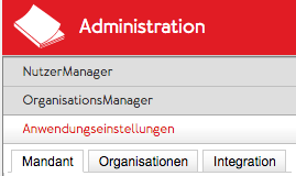 Dem ApplicationContainer "Administration" sind in diesem Beispiel also die Apps NutzerManager, OrganisationsManager, Anwendungseinstellungen und Systemeinstellungen zugewiesen. Es kann immer nur eine App aktiv sein. Das Öffnen einer App durch Anklicken des entsprechenden Tabs im linken Bereich schließt automatisch die bisher geöffnete App. Dieses Verhalten kann leicht umgangen werden in dem mehrere Browserfenster oder Browsertabs den gleichen ApplicationContainer mit unterschiedlichen geöffneten Tabs darstellt.