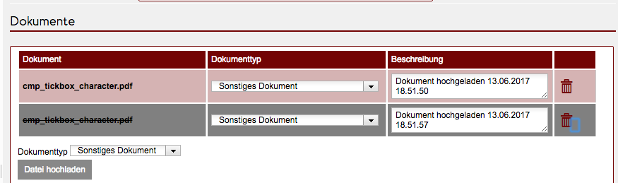 Um ein Dokument zu löschen schalten Sie die Tabelle in den Bearbeitungsmodus. Mit dem "Mülleimer-Symbol" am Ende jeder Zeile können Sie das Dokument löschen.