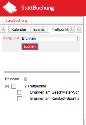 Geben sie optional einen Teil des internen oder externen Namens des Treffpunkts als Filterkriterium ein und klicken Sie auf suchen. Falls kein Filter eingegeben wird, werden alle Treffpunkte gesucht.