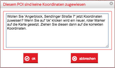 Wird die Checkbox eines Treffpunktes, dem noch keine Koordinaten zugewiesen sind, angeklickt erscheint folgender Dialog: