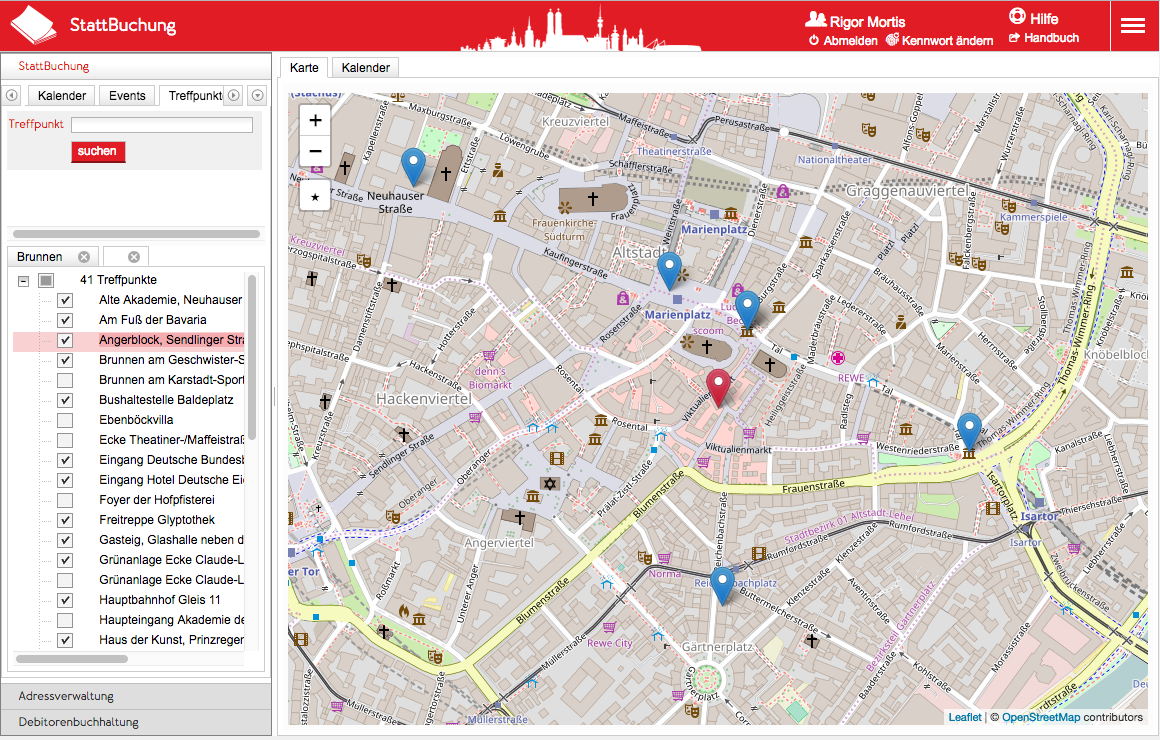 Um einen Treffpunkt anzuzeigen setzen Sie einen Haken in die Checkbox des Treffpunktes. Dadurch wird der Treffpunkt als sog. Marker auf die Karte gebracht. Der Standard-Marker ist ein blaues Fähnchen mit einem Callout das die Adresse des Treffpunktes angibt. Es können beliebig viele Treffpunkte auf der Karte angezeigt werden, ein Klick auf die Wurzel des Baumes ("41 Treffpunkte") zeigt alle Treffpunkte auf der Karte an.
