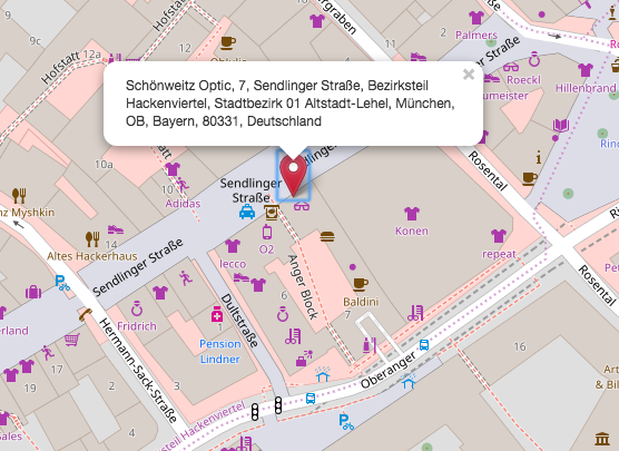 Ziehen Sie den roten Marker in Richtung Zielkoordinaten (im Beispiel Sendlinger Str. 7). Sie müssen nicht sofort die richtigen Koordinaten finden, was bei dem gewählten Zoomleven auch nicht einfach wäre. Immer wenn Sie den roten Marker an eine neue Position ziehen wird die Karte automatisch auf diese zentriert und sie können den Marker wieder weiter ziehen. Außerdem wird die neue Position sofort invers geokodiert und das Callout des Marker verrät Ihnen wo der Marker gerade steht: