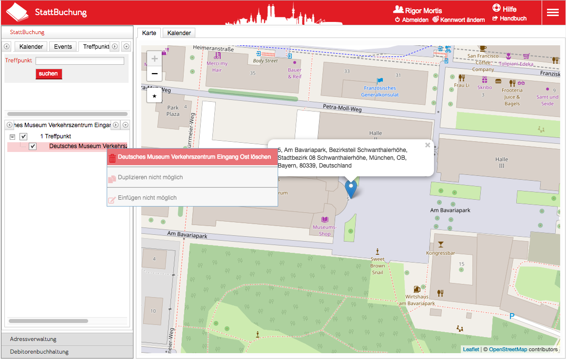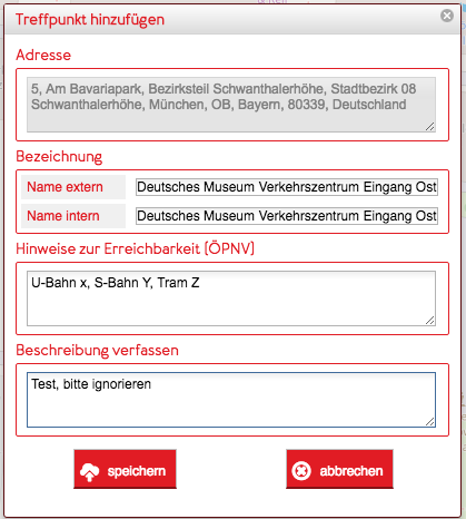 Die Adresse des Treffpunktes ist das Ergebnis der inversen Geokodierung der Koordinaten und kann nicht direkt bearbeitet werden. Verschiebt man den Marker eines Treffpunktes auf der Karte wird die neue Position (genauer: Die Koordinaten der neuen Position) erneut invers geokodiert und das Ergebnis überschreibt die bisherige Adresse.