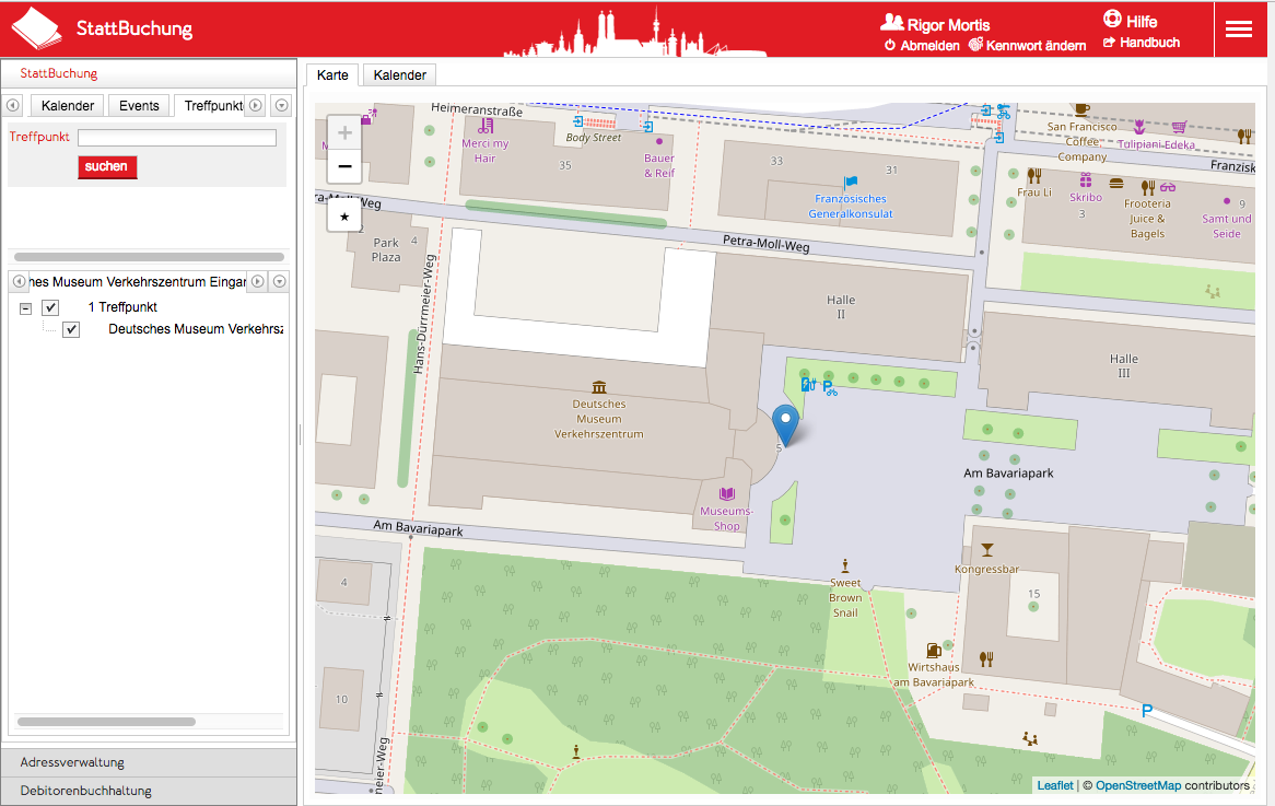 Der neue Treffpunkt wird automatisch auf der Karte als Marker angezeigt und in einem neuen Suchergebnisbaum, der natürlich nur genau ein Ergebnis anzeigt, im linken Bereich dargestellt.